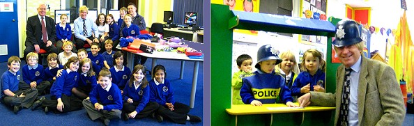Photographs show Michael Fabricant with Head Teacher Lester Davies (back row left) in a computer class and Michael having his finger prints taken by Archie Allport (wearing the police helmet) while Xander Webb, Lauren Mace, and Abbie Brown – all aged 3 – all watch on.